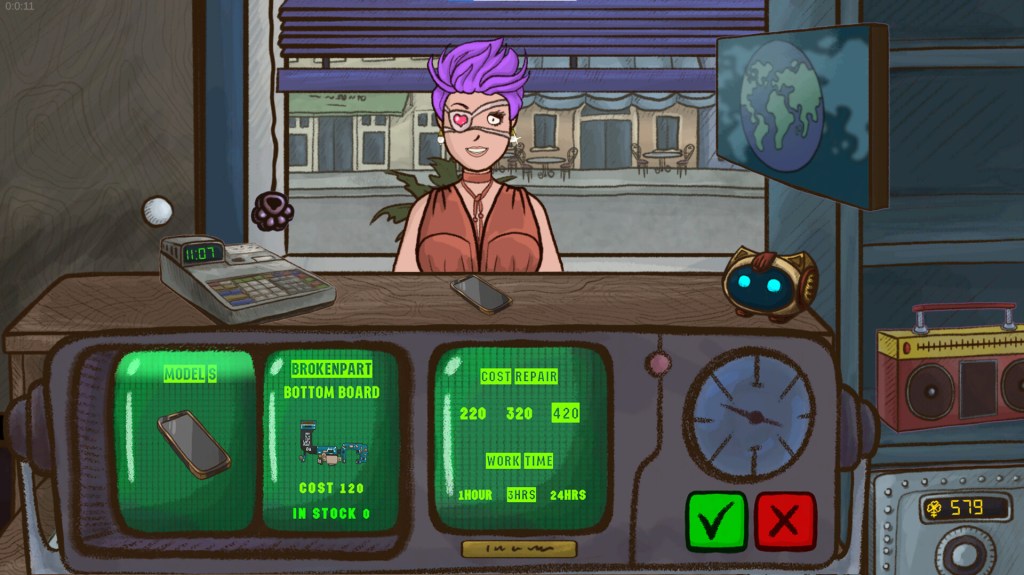 The game plays as a first person view, with a 2D cartoon visual style. The style, the cartoonish aesthetic and the gameplay are all reminiscent of Papers, Please. It’s obvious that the creator drew inspiration from this classic. The gameplay is simple. You help one customer after another until the day ends. Taking cues from what the customers tell you and their looks, you will have to decide how long it will take you to repair their phone and how much you can charge them. If you ask too much or take too long the customer may choose to go elsewhere. You may also choose to work for a nameless government agency for extra money. You have the option of snooping in your customer’s phone after you fix them. Additionally at the end of each day you can look at the business cards you collected that day and choose what to do: get a new sign for your store, visit that beautiful girl that left you her phone number, or even visit the bar across the street. This adds another layer to the narrative.