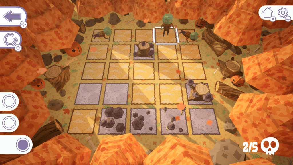Mycelium Heaven involves a lot of strategy. You have to plan your moves ahead, and know when to consume a zombie of part thereof to ensure that you have enough energy to complete the level. The game also has many unique mechanics. Every season has some new mechanics being introduced like the tree trunk and grave zombies. In the first area you are introduced to the tree trunk. When you consume this tree trunk and grow mushroom on it, it’ll let you expend the area you can reach further than you would normally with a regular tile. This is only one of many novel mechanics that are introduced throughout the game. I love that the mechanics are sparsely introduced in each area because it helped keep me interested until the end.